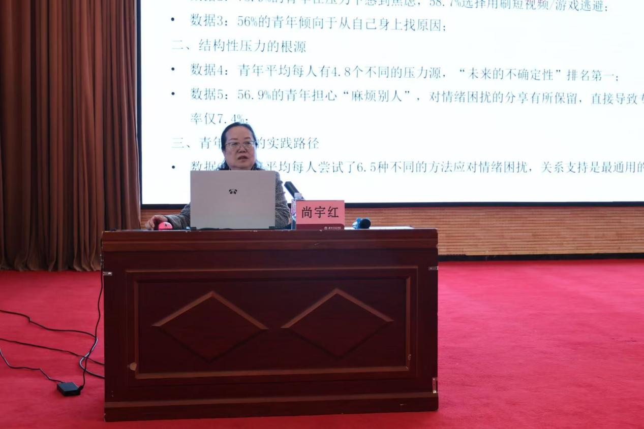 培训伊始,尚宇红教授结合《2026 青年情绪白皮书》核心数据,深入剖析当前青年学生情绪困境现状、结构性压力根源与自救实践路径,用真实数据直观呈现大学生心理健康需求,让在场师生清晰认识到心理健康工作的重要性与紧迫性。